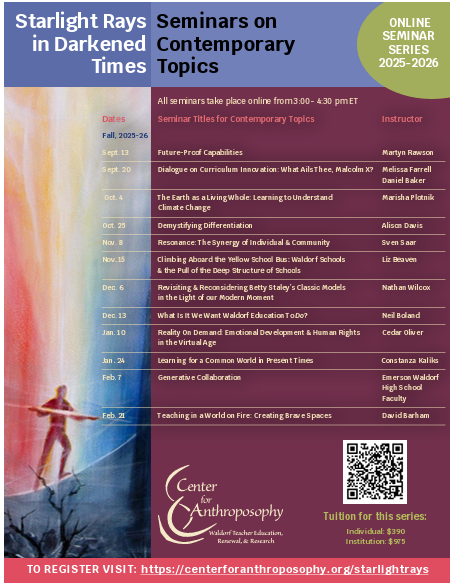 Through our series of “Starlight Rays in Darkened Times: Seminars on Contemporary Topics for Waldorf High School Teachers,” we are attempting to tackle the enormous questions of the world. Essentially, every speaker we bring in to engage with our participants is asking some version of the archetypal Parzival question, “What ails thee?” And equally importantly, “How can I help?” We have just completed the third cycle of this series, during which time we have explored questions of